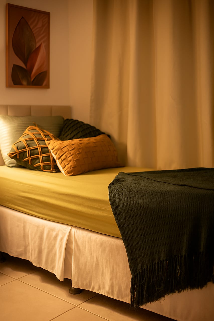 No interior, o quarto apresenta duas camas de solteiro e uma decoração tropical, com cores suaves. Ambiente arejado e fresco independentemente da temperatura externa.